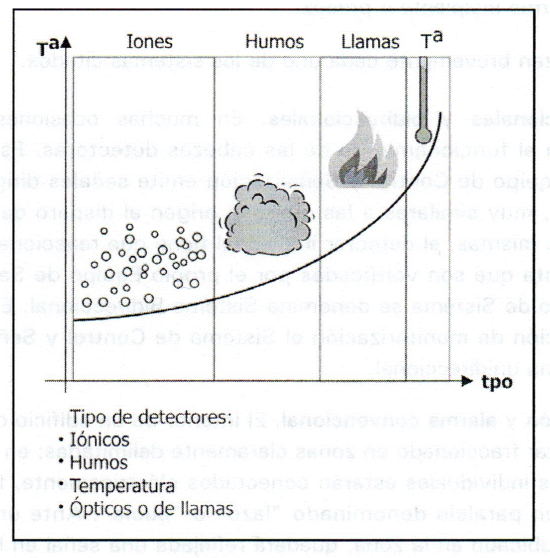 Si se analiza un fuego tipo, al comienzo se van a desprender iones o radicales libres, como consecuencia de la «pirólisis» del combustible. En una posterior etapa, podrán emitirse humos. Seguidamente, se generarán las llamas Por último, y en su desarrollo final, se incrementará la temperatura de los humos.